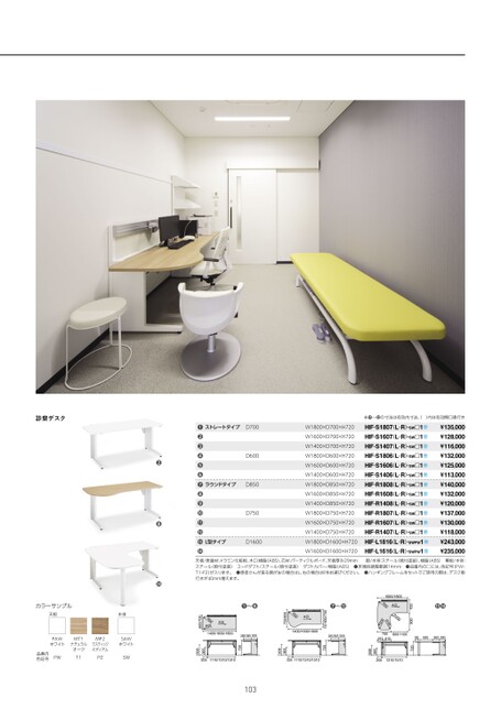 ❶ストレートタイプD700W1800×D700×H720HIF-S1807(L¿R)-SW¡1Ω¥135,000❷W1600×D700×H720HIF-S1607(L¿R)-SW¡1Ω¥128,000❸W1400×D700×H720HIF-S1407(L¿R)-SW¡1Ω¥116,000❹D600W1800×D600×H720HIF-S1806(L¿R)-SW¡1Ω¥132,000❺W1600×D600×H720HIF-S1606(L¿R)-SW¡1Ω¥125,000❻W1400×D600×H720HIF-S1406(L¿R)-SW¡1Ω¥113,000❼ラウンドタイプD850W1800×D850×H720HIF-R1808(L¿R)-SW¡1Ω¥140,000❽W1600×D850×H720HIF-R1608(L¿R)-SW¡1Ω¥132,000❾W1400×D850×H720HIF-R1408(L¿R)-SW¡1Ω¥120,000D750W1800×D750×H720HIF-R1807(L¿R)-SW¡1Ω¥137,000W1600×D750×H720HIF-R1607(L¿R)-SW¡1Ω¥130,000W1400×D750×H720HIF-R1407(L¿R)-SW¡1Ω¥118,000L型タイプD1600W1800×D1600×H720HIF-L1816(L¿R)-SWPW1Ω¥243,000W1600×D1600×H720HIF-L1616(L¿R)-SWPW1Ω¥235,000診察デスク※〜の寸法は有効内寸法、)内は有効開口奥行き天板/表面材:メラミン化粧板、木口:樹脂(ABS)、芯材:パーティクルボード、天板厚み29mm脚/本体:スチール(焼付塗装)、樹脂(ABS)幕板/本体:スチール(焼付塗装)コードダクト/スチール(焼付塗装)ダクトカバー/樹脂(ABS)●床傾斜調整範囲14mm●品番内の□には、色記号(PW・T1・P2)が入ります。●患者さんが座る側が左の場合はL、右の場合はRをお選びください。●ハンギングフレームをセットでご使用の際は、デスク奥行きが40mm増えます。図面_HIF-L1616図面_HIF-S1607図面_HIF-R1608●●1626953653007009007201600/1800木目R50●〜●●〜●R3500R02R150365508265/365300700312312900/1100600/7001507201400/1600/1800木目R50750/8501400/1600/1800265/365300木目R5005R600/7003655087203655082051110/1310/15102051110/1310/15102051310/1510103●●●カラーサンプル天板本体PAWホワイトMT1ナチュラルオークPWT1MP2ラスティックミディアムP2SAWホワイトSW品番内色記号