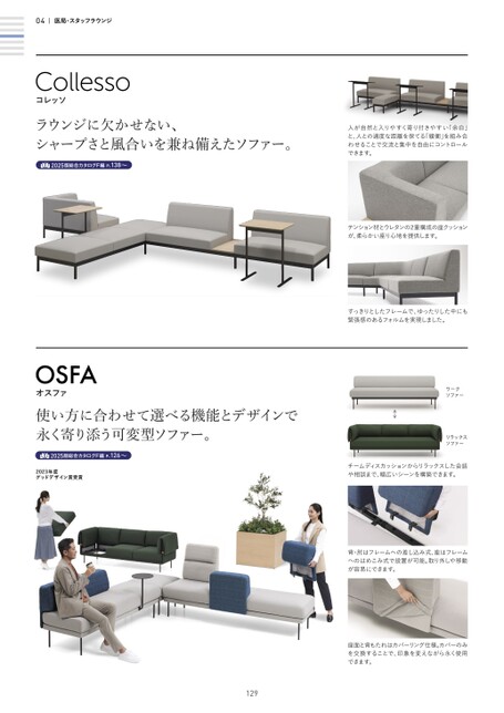 04医局・スタッフラウンジコレッソラウンジに欠かせない、シャープさと風合いを兼ね備えたソファー。ß2025版総合カタログF編P.138〜人が自然と入りやすく寄り付きやすい「余白」と、人との適度な距離を保てる「緩衝」を組み合わせることで交流と集中を自由にコントロールできます。テンション材とウレタンの2重構成の座クッションが、柔らかい座り心地を提供します。すっきりとしたフレームで、ゆったりした中にも緊張感のあるフォルムを実現しました。オスファ使い方に合わせて選べる機能とデザインで永く寄り添う可変型ソファー。ß2025版総合カタログF編P.126〜2023年度グッドデザイン賞受賞ワークソファーリラックスソファーチームディスカッションからリラックスした会話や相談まで、幅広いシーンを構築できます。背・肘はフレームへの差し込み式、座はフレームへのはめこみ式で設置が可能。取り外しや移動が容易にできます。座面と背もたれはカバーリング仕様。カバーのみを交換することで、印象を変えながら永く使用できます。129